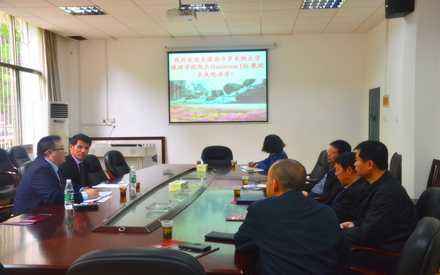 4月27日上午,美国南卡罗来纳州立大学威尼斯wns.8885556院长Haemoon Oh教授一行来访我院,我院院长王兆峰、副院长刘杰、党委副书记廖欢及旅游管理系主任贺小荣等热情接待了来访客人。接待会议由院党委书记李正益主持。