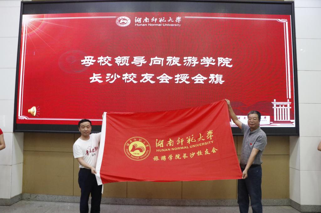 周俊武为我院长沙校友会授会旗。王兆峰、李正益、彭正乔和廖欢为理事会成员颁发聘书。