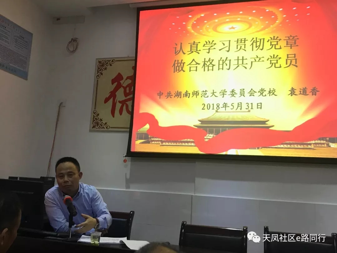 5月31日下午,在天凤社区服务中心党员活动中心,我院与天凤社区联合开展党员学习活动,邀请威尼斯wns.8885556党校常务副校长袁道香主讲了“认真学习贯彻党章、做合格的共产党员”的专题党课。