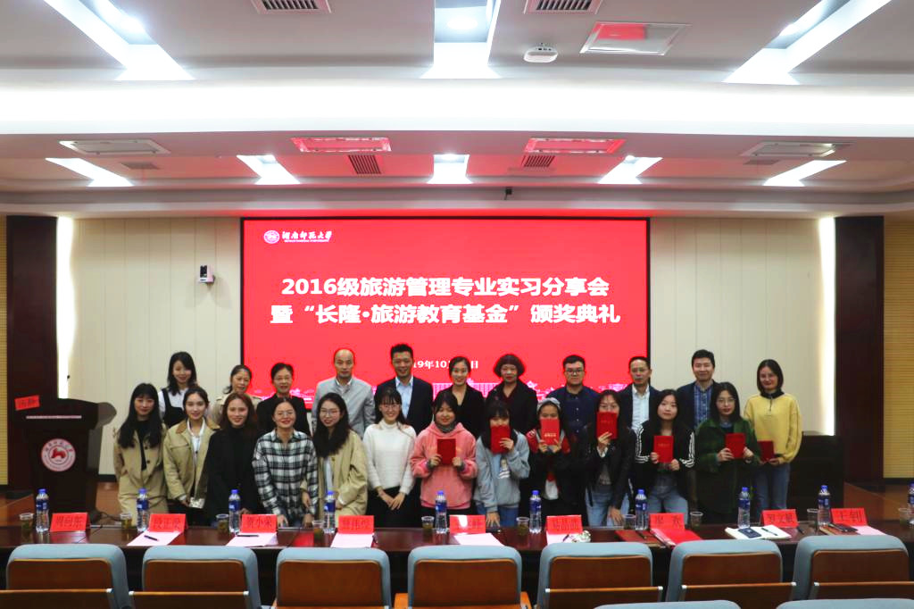 (通讯员 宁晓洲 史雅童 朱彤)10月17日下午,我院于中和讲堂举行2016级旅游管理专业实习分享会暨首届“长隆·旅游教育基金”颁奖典礼。广州长隆集团人力资源部总监詹伟煌、招聘部部长易晶晶,我院院长王兆峰、副院长贺小荣、党委副书记廖欢。典礼由旅游管理系副主任汤静主持。