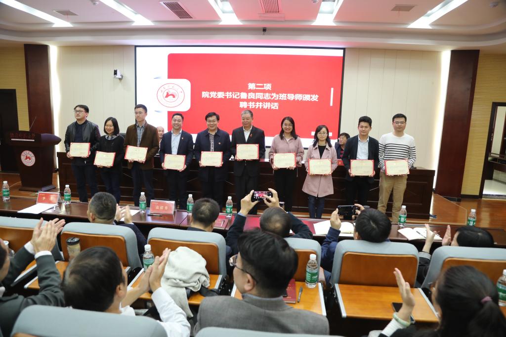 院党委书记鲁良为全体班导师颁发聘书并讲话。他代表学院以及正在外地出差的王兆峰院长感谢周俊武副校长、向发意部长等老师担任学院的班导师,并以把关爱学生内化为信仰信念、把三全育人实化为办法举措、把青春梦想转化为定力动力与在场师生共勉。