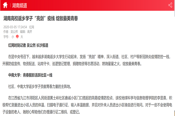 【抗疫一线】《新湖南》、《红网》等媒体报道我院学子段婷参与抗疫志愿活动