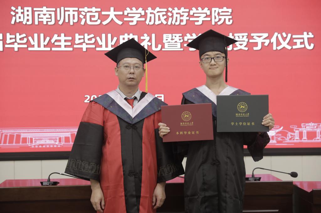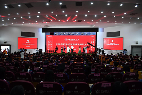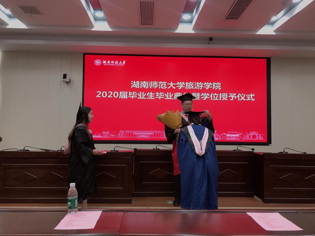 上午9时,2020届毕业生代表于在中和讲堂观看我校毕业生毕业典礼暨学位授予仪式直播。直播结束后,全体毕业生代表依次上台,王兆峰院长亲自为每一位毕业生正冠拨穗,并授予毕业证书和学位证书。