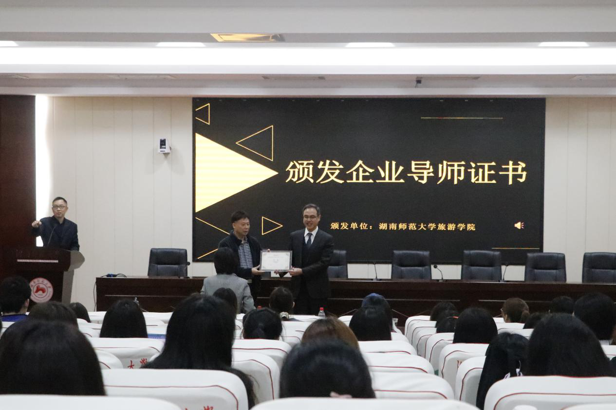 讲座开始前,院长王兆峰教授代表学院向周涛颁发企业导师证书。