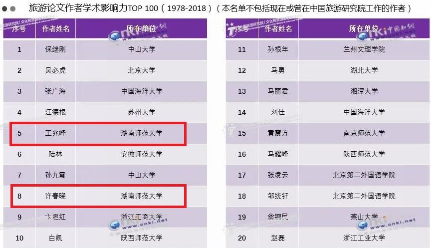 据悉,本次榜单是通过定量定性相结合的评选方式,科学、客观地遴选出在一定时间范围内(1978年1月1日至2018年12月31日期间发表)最具影响力的学术论文和作者。在“旅游论文学术影响力Top100”榜单中,郑群明教授等2位学者的《参与式乡村旅游开发模式探讨》位居第8位;王永明副教授等2位学者的《城市旅游经济与交通发展耦合协调度分析——以西安市为例》位居第75位,贺小荣教授的《我国乡村旅游的起源、现状及其发展趋势探讨》位居第88位。在“旅游论文作者学术影响力Top100”榜单中,学院王兆峰教授、许春晓教授、王凯教授、贺小荣教授、郑群明教授分别位居第5、第8、第43、第75、第88名。