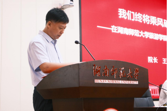 王兆峰致辞,他代表学院对2021级新生的到来表示热烈欢迎与衷心祝福。他简要介绍了学校和学院的基本情况,并表示在历经近2年全球新冠疫情的肆虐和人间隔离,大家今天在岳麓山下、湘江之畔的相逢是时代赋予的特别意义,是致力于人类健康幸福产业的旅游学科专业赋予的特别意义。他对新生提出三点希望:一是明确目标,在追求高远中提升人生境界。要把握好每一个重要的人生节点,及早规划和制定学年计划与职业规划;二是知行合一,在理论学习与实践探索相结合中树立修为典范。鼓励大家多基于问题、项目和竞赛开展学习,既“手留书香”又“脚沾泥土”;三是执着坚守,在攻坚克难中追求卓越。每一位同学都要进行思路的转换和行动的改变,要在前进的道路上练就更强大的内心。他相信,只要大家努力拼搏奋斗,一定能够乘风破浪、向阳而生。