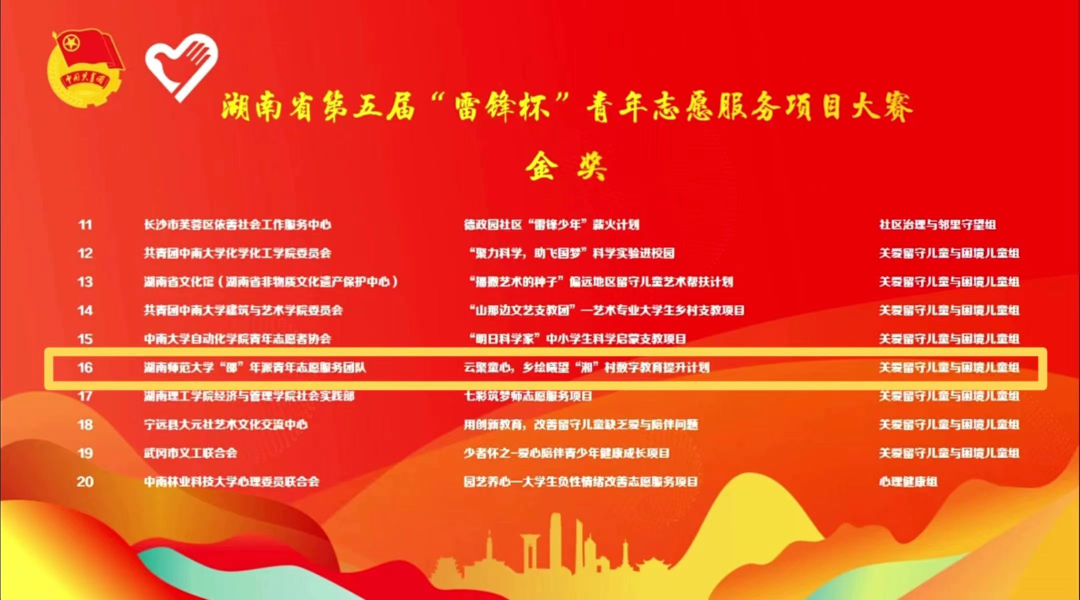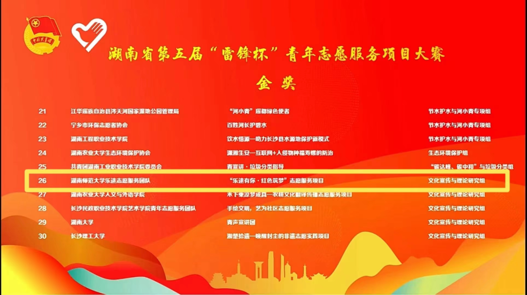 近日,湖南省第五届“雷锋杯“青年志愿服务项目大赛决赛顺利落幕。我院“乐途有你·红色筑梦“和“云聚童心·乡绘曦望”2个项目获得金奖。