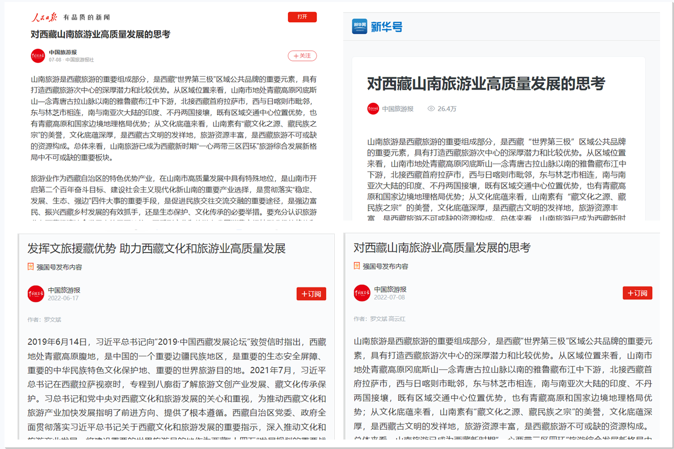 围绕山南全域旅游发展,结合调研实际,罗文斌老师充分发挥自身专业优势,撰写了《以“四个创建”为目标指引,突出民族地域生态边境特色,推进山南市旅游高质量发展》《守望山南旅游发展需要“旅游人”共同的责任意识和集体行动》等10余篇近5万字的调研报告和政策建议文章,形成了山南市旅游高质量发展和全国文旅援藏为主题的系列理论成果。