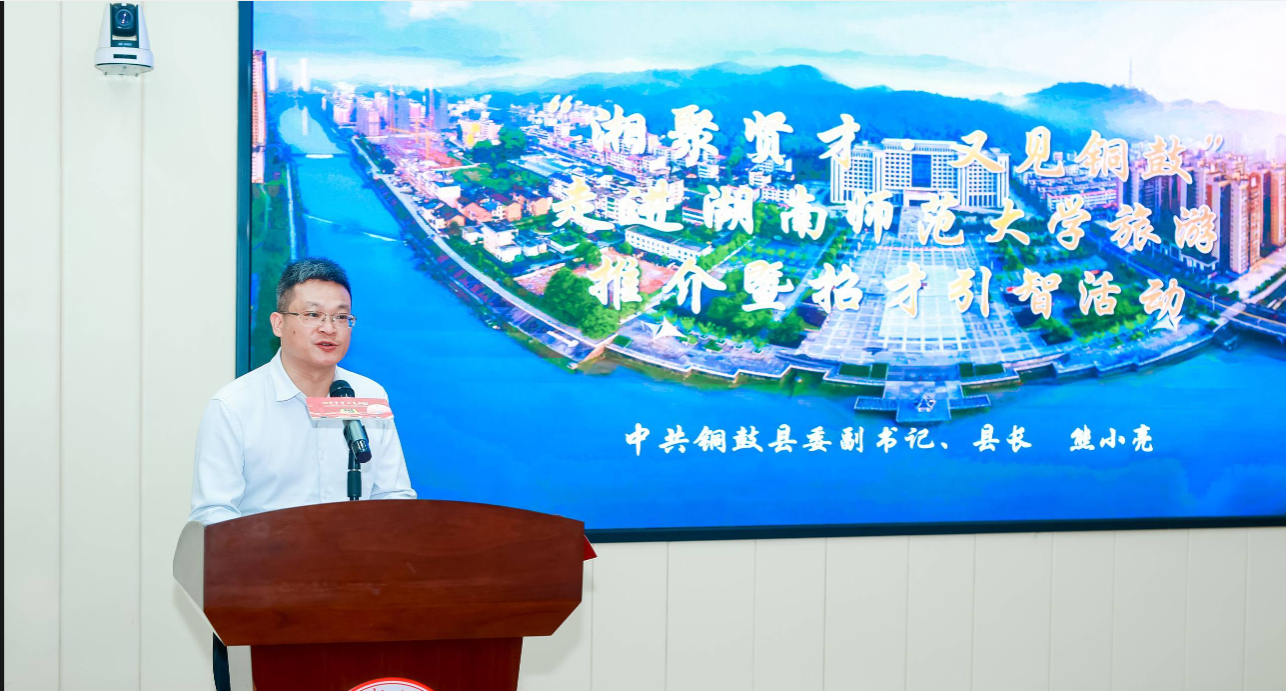 熊小亮代表铜鼓县致辞。他向学校和学院为本次活动的举办给予的支持表示感谢,他简要介绍了铜鼓的名字由来、地理位置、生态环境、生态文明建设成就和丰富的旅游资源并指出铜鼓是革命起源的红色圣地、生态优美的康养胜地、活力迸发的创业宝地和文化厚重的善治高地,热切欢迎我校师生前往参观、学习和工作。他表示,期待双方在产教融合、效益构建等方面进一步深度合作,共同谱写湘赣边区域合作的新篇章。
