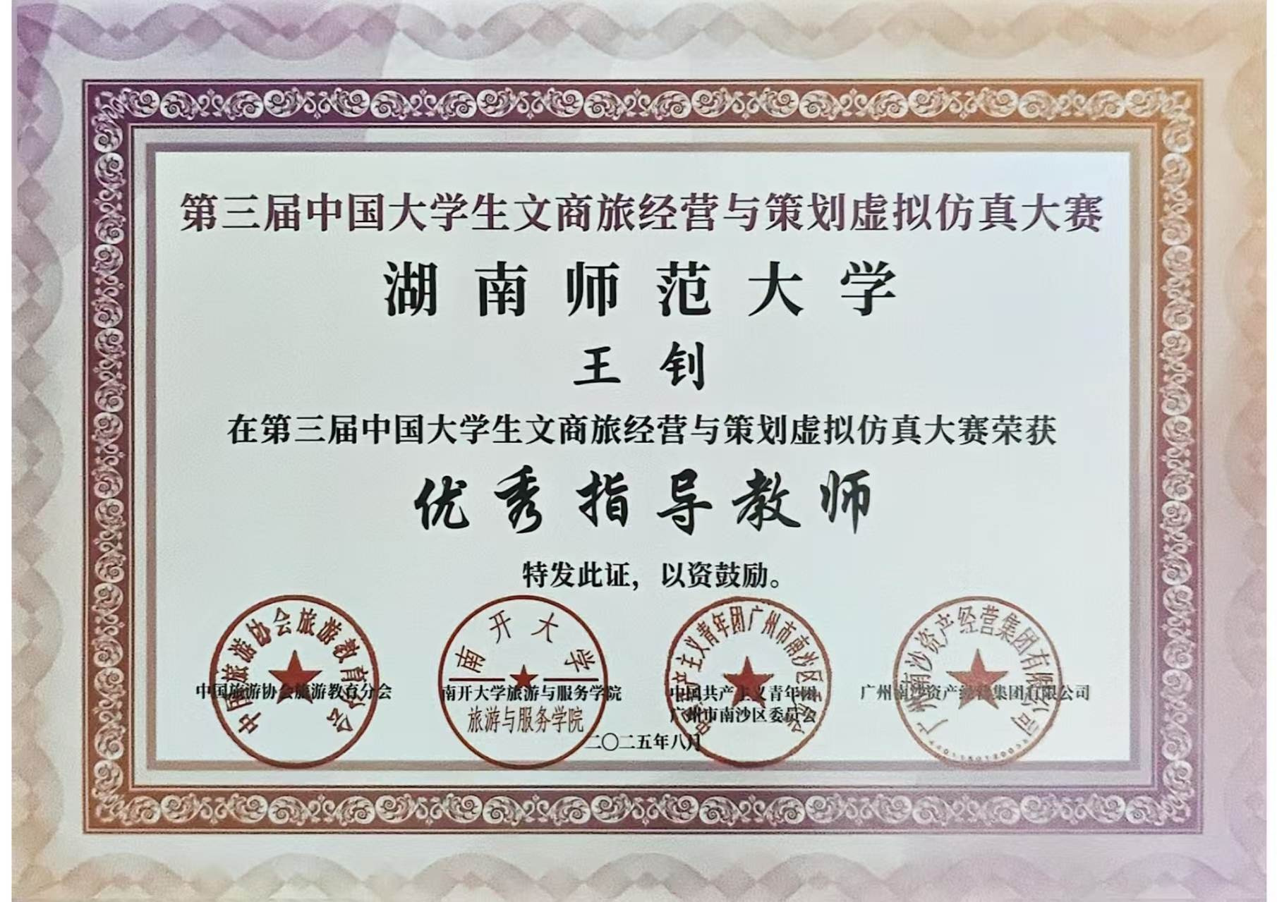 8月19日至24日,第三届中国大学生文商旅经营与策划虚拟仿真大赛总决赛在广州南沙举办,我院旅游管理系副教授王钊老师指导的尹丙奇、向祥胜、刘金阳、周赛本科生团队斩获全国二等奖,王钊老师获评“优秀指导教师”,系我院学子继第二届大赛后再度获此全国性赛事佳绩,彰显专业育人实力。