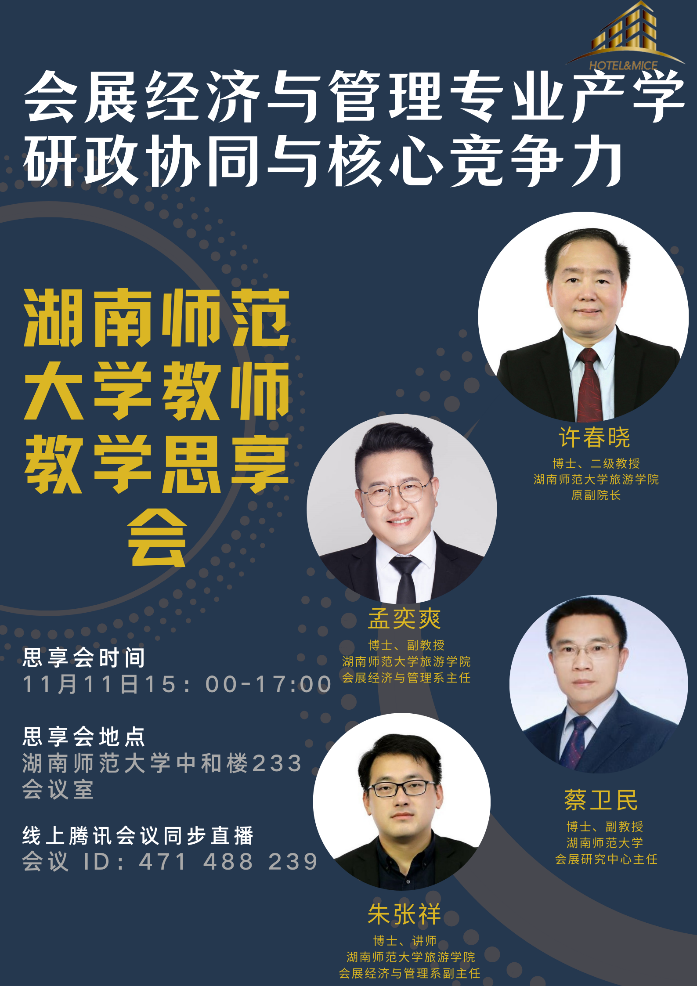 本次教学思享会主要汇报了湖南省教改课题、我校教改重大课题《产学研政协同的会展经济与管理专业人才培养模式建构》的主要成果。威尼斯wns.8885556原副院长许春晓教授、会展经济与管理系主任孟奕爽副教授、会展中心研究主任蔡卫民副教授、会展经济与管理系副主任朱张祥博士分别进行了主题发言。