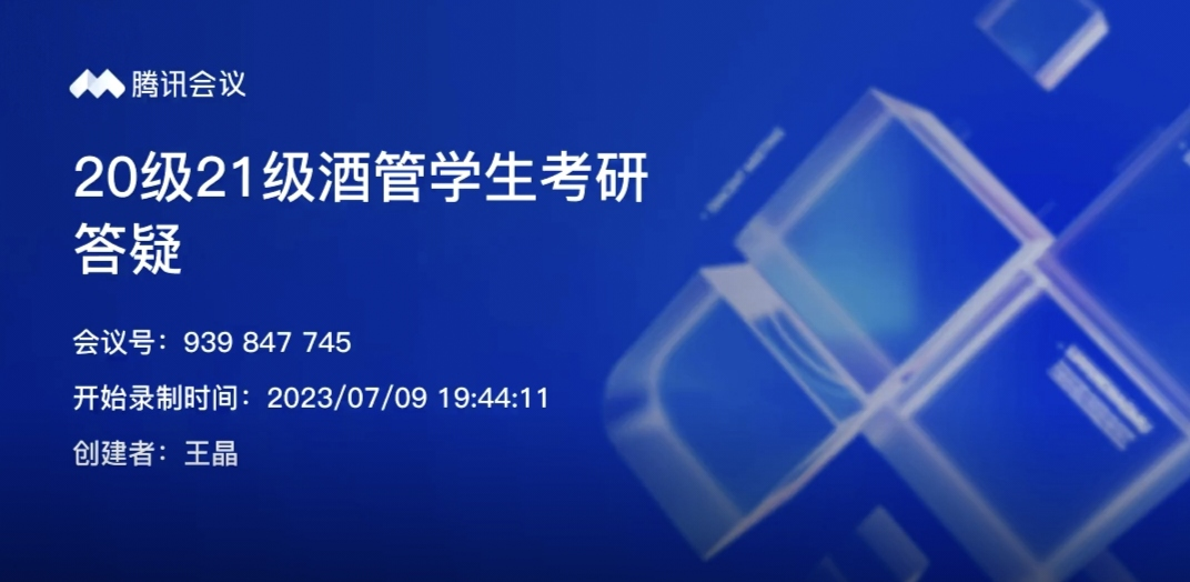 为帮助2020级酒店管理专业学生进一步解决考研备考中的各种问题和困惑,同时助力2021级的同学明晰考研目标并提前做好准备,我院酒店管理系于2023年7月9日晚举行线上考研答疑分享会,主讲人为我院唐健雄老师、刘颖洁老师、贺凯健老师以及2022级职业技术教育专业硕士研究生黄梦雪和2019级酒店管理专业本科生叶梦宁。此次分享会采用线上会议的形式,由我院王晶老师主持,60多名学生参会。