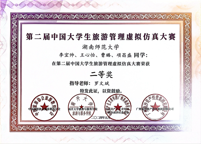 经过为期五天的紧张决赛,我院代表队在“虚拟仿真电子竞技环节”和“实践策划环节”均取得了优异的成绩。最终,在指导老师罗文斌教授的精心指导下,团队以综合成绩全国第34名荣获“第二届中国大学生旅游管理虚拟仿真大赛”全国二等奖。