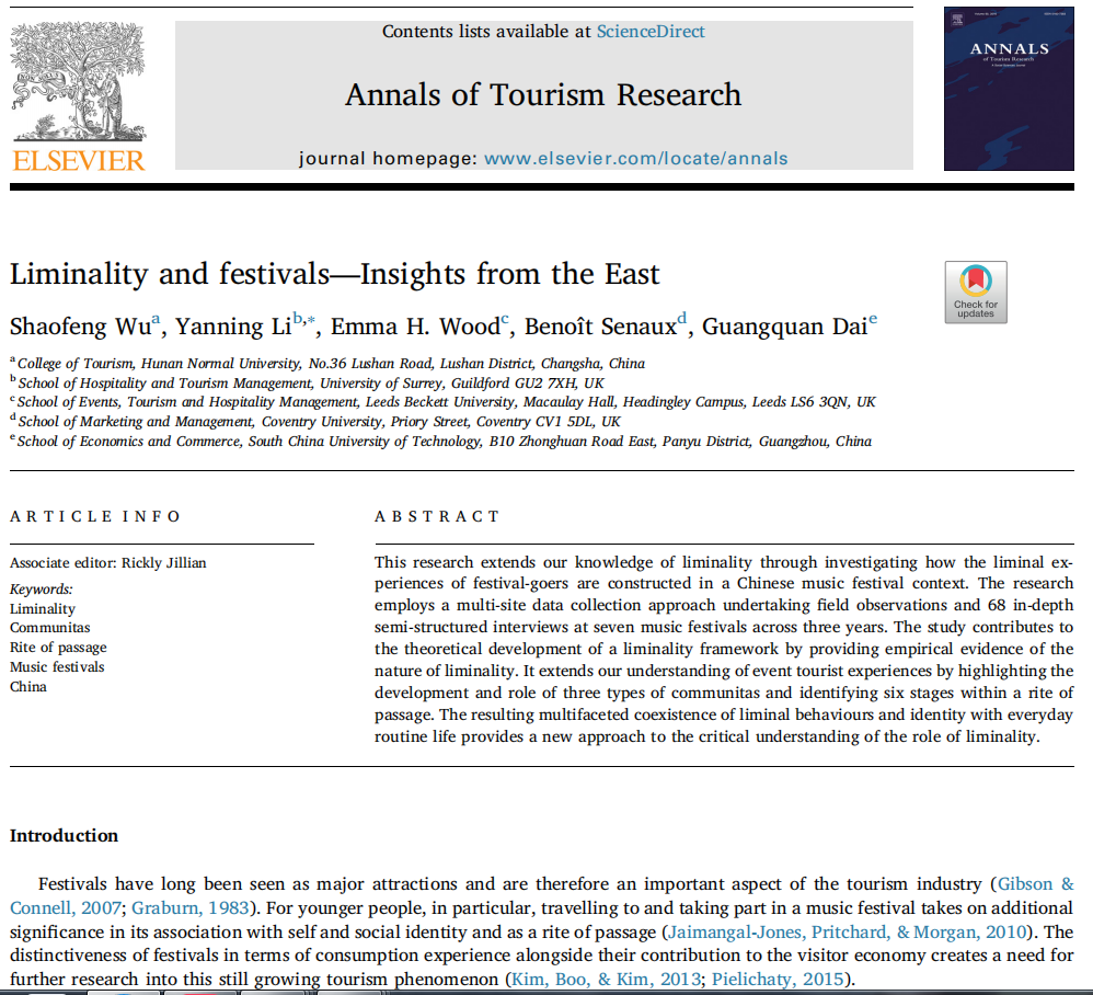 近日,国际旅游学科顶级权威期刊《Annals of Tourism Research》接收并刊发了我院会展经济与管理系吴少峰博士任第一作者、威尼斯wns.8885556为第一单位,英国萨里大学李艳凝等四位学者合作完成的论文《Liminality and festivals—Insights from the East》(Volume 80, January 2020, 102810)。《Annals of Tourism Research》是国际公认的最顶尖的旅游学术期刊,代表着国际旅游学术研究的最高水平,在国际旅游研究领域享有崇高的声誉。该刊被评级为ABS四星级和中科院SSCI管理学大类一区期刊。