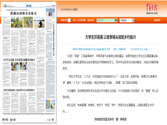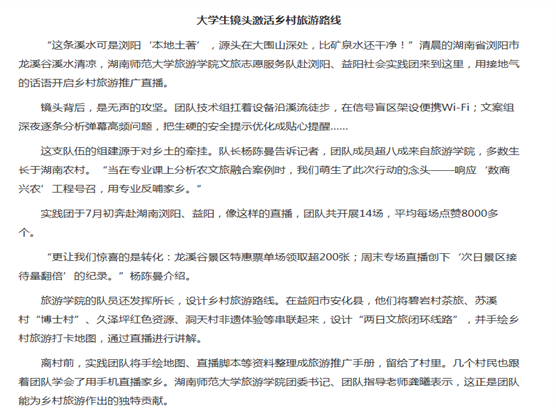 《中国青年报》重点报道了我院文旅志愿服务队志愿者在浏阳、益阳通过“直播+文旅”新模式赋能乡村振兴的实践探索。在浏阳市龙溪谷,团队克服信号盲区困难,开展14场文旅直播,累计收获数万点赞,带动景区次日客流翻倍;益阳市安化县团队结合茶旅、红色资源与非遗体验,设计“两日文旅闭环线路”,手绘乡村旅游打卡地图,并帮助村民学习直播技能,为乡村文旅发展留下了一份可持续的“青春方案”。