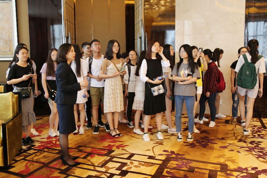 为了让同学们更好的体会酒店气氛,将同学分为五组,依次参观了酒店宴会厅、婚典中心、酒店大厅、客房等,酒店方细致全面的讲解让同学们了解对方的需求、更好的把握策划要求和目标,过程中双方互动频繁,气氛融洽。