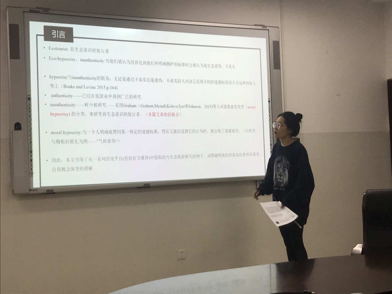 本次会议由胡兵、石松和朱张祥三位老师的研究团队进行了学术汇报。其中,18级旅游地理专业研究生张晓倩汇报了自己关于在线旅游研究的阶段性成果,在场老师就论文的进一步改进提出了建议。18级旅游地理专业研究生沈玲结合自己的研究方向分享了国际旅游学科顶级期刊《Annals of Tourism Research》2020年发表的《Eco-hypocrisy and inauthenticity: Criticisms and confessions of the eco-conscious tourist/traveller》一文,并分享了自己在研究内容和研究方法方面的学习收获。19级旅游地理专业研究生唐佩做了国际顶级期刊跟进,对《Annals of Tourism Research》最新出版的11篇文献进行了介绍。在三位同学的汇报过程中,各位老师发表了评论,并讨论了科研过程中需要注意的一些问题,提出相关建议。