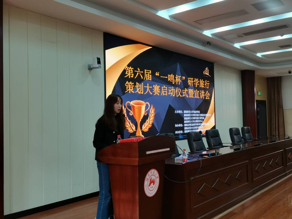 (通讯员 唐爽 刘茜) 11月22日,我院在中和楼中和讲堂举办第六届“一鸣杯”研学旅行策划大赛启动仪式。 此次活动由我院酒店与会展协会承办,21级辅导员赵雅旋主持,出席此次活动的还有:院党委副书记廖欢,院团委书记龚曦,我院副教授孟亦爽,湖南宏博百航研学教育咨询有限公司和湖南应景文化创意有限公司的负责人。