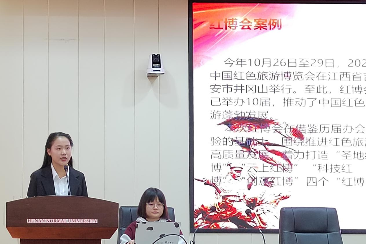 四位主讲人分别结合自身实践经历与专业知识讲述了对红色精神的研究。19级会展班学生李秧讲述了红博会在当今时代创新宣扬红色精神的方式,同时结合自身专业,阐述了如何通过文旅实践活动传承红色基因。19级旅管班学生刘心雨结合赴平江县调研的实践经历,以微漫故事形式介绍了伟大建党精神。20级国旅班学生陈宇结合暑期三下乡实践经历,讲述了红色旅游对于赓续伟大建党精神的重要意义。19级国旅班学生黄静云分享了在澳门威尼斯wns.8885556交流的心得体会,并讲述了当今澳门的变化。