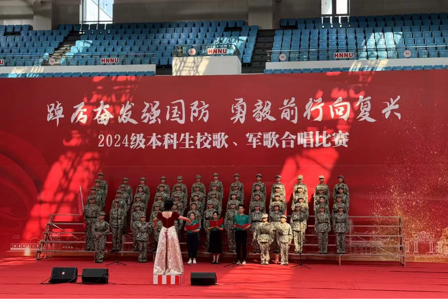 (通讯员 彭霖钢)为传承红色基因,弘扬爱国精神,9月18日下午,我院于江湾体育馆参加“踔厉奋发强国防 勇毅前行向复兴”2024级本科生校歌、军歌合唱比赛。院党委副书记廖欢,院专职组织员骆劲华,学工办辅导员李天宇,我院军训合唱团全体成员参加此次比赛。