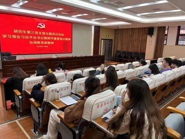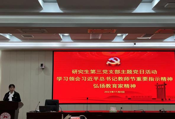 11月8日,我院研究生第三党支部在中和楼中和讲堂开展“学习领会习近平总书记教师节重要指示精神,大力弘扬教育家精神”主题党日活动,支部“第一书记”王晶老师指导,会议由支部书记刘银主持。