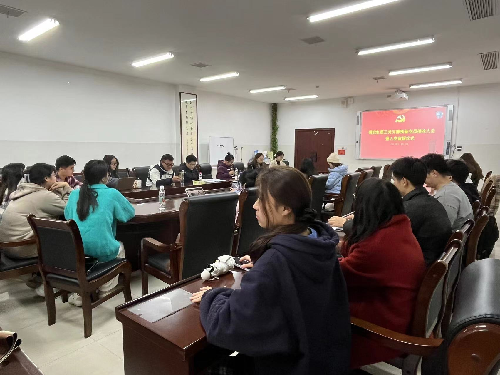 11月15日下午,研究生第三党支部于中和楼233会议室召开党员大会讨论接收预备党员,会议由支部书记刘银主持,支部“第一书记”王晶老师及全体党员参加。