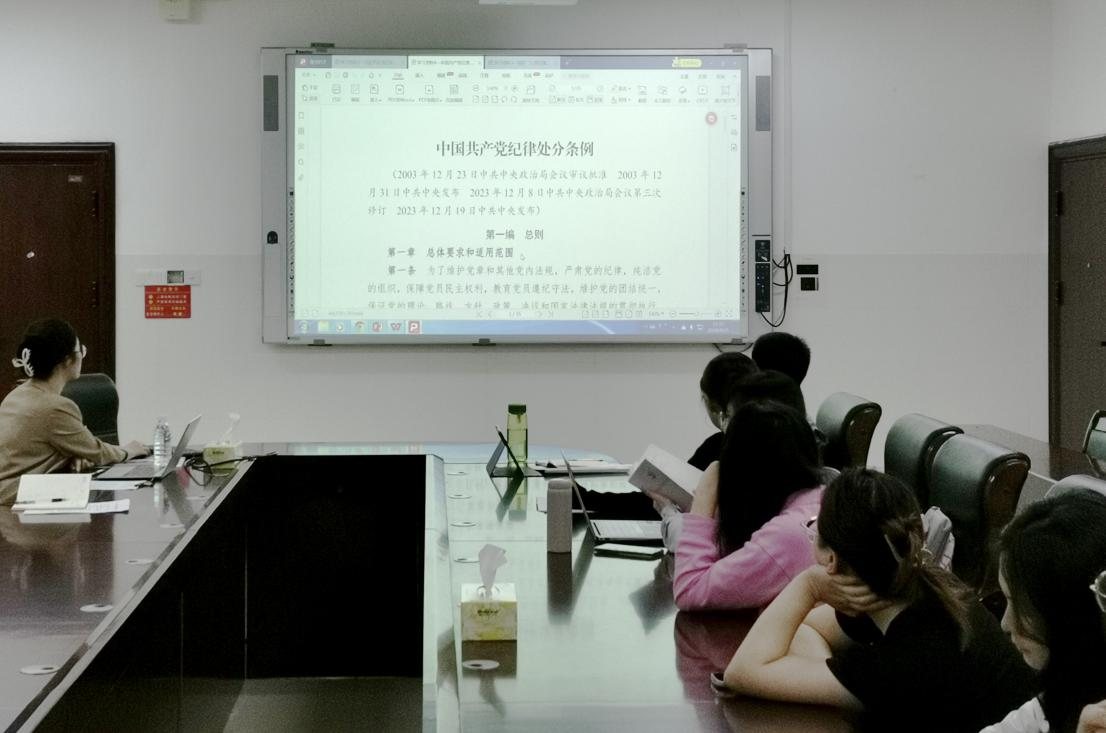 刘洁领学了习近平总书记关于党纪学习教育的重要讲话精神,引导全体党员同志强化纪律意识,严守纪律规矩。全体党员共同学习了《中国共产党纪律处分条例》并分享了学习感悟,切实把贯彻《条例》的学习宣传作为当前一项重要任务抓实抓好,营造学纪、知纪、明纪、守纪的浓厚氛围。