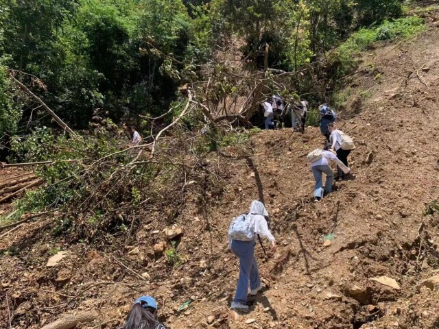 (图为成员经过塌方路段 徐国根摄)